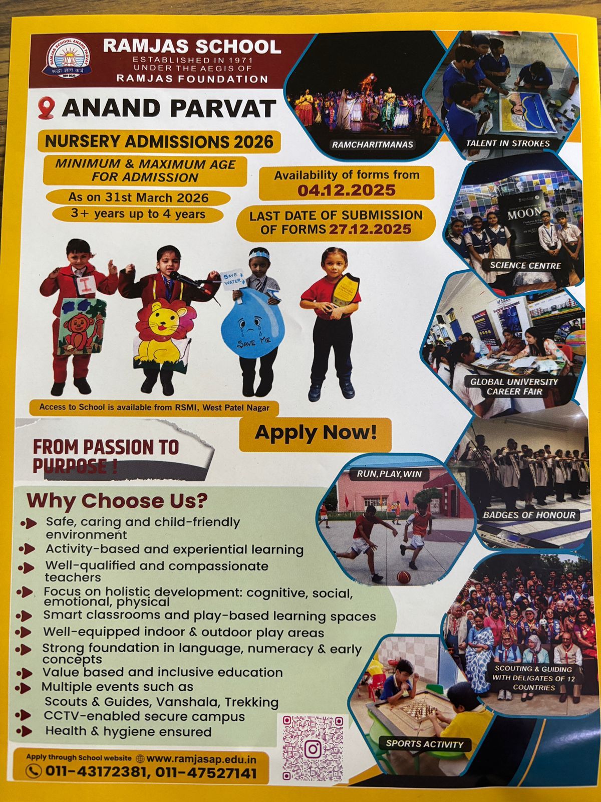 The Ramjas Foundation established its first unaided Nursery/Primary school in May 1971 under the name of Ramjas School (Anand Parbat). A Committed Foundation with a visionary zeal had the foresight to educate and develop students capable of leading independent India. Since then the school has crossed many milestones and gradually upgraded to a Senior Secondary School with more than 1900 students. It is affiliated to C.B.S.E. The school places academic excellence and innovation in education as its prime objectives which are now more achievable with the installation of smart boards in all classrooms. Ample opportunities are provided for the multidimensional growth of the students.